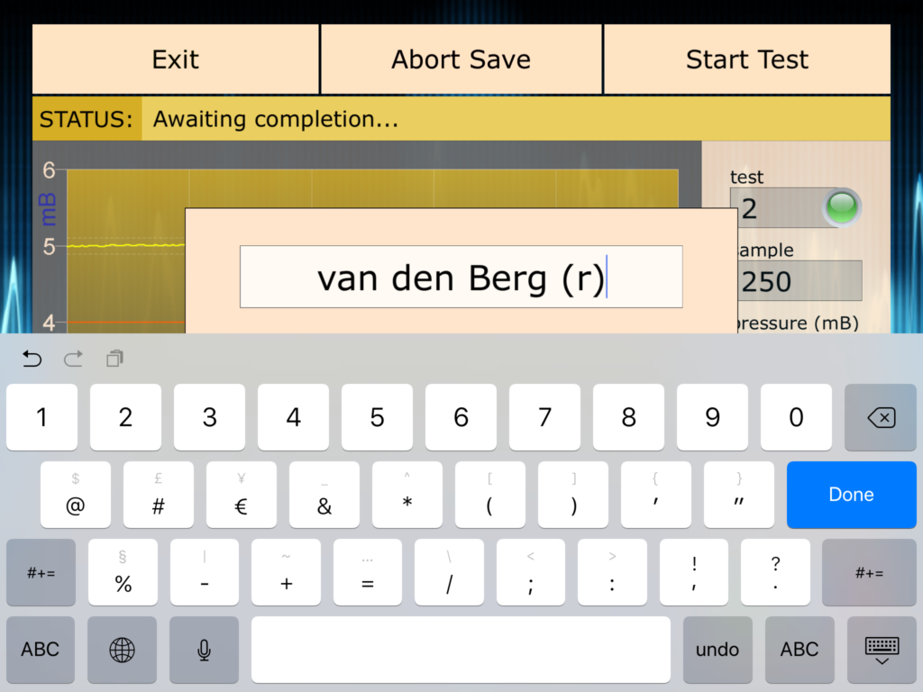 In onderstaande afbeelding ziet u een screenshot van de iOS app op een iPad, na een ideale meting tijdens het archiveren van de curve.